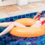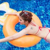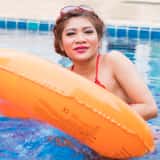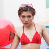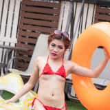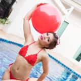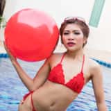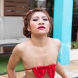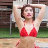 Hana is such a beautiful girl that I can't stop taking photos of her. With her amazing natural gymnast body, I can't get enough. This time Hana is in a red string bikini and she's taking a dip in the pool. When she returns to the edge, Hana strips off her bottoms to reveal her lovely shaved pussy.